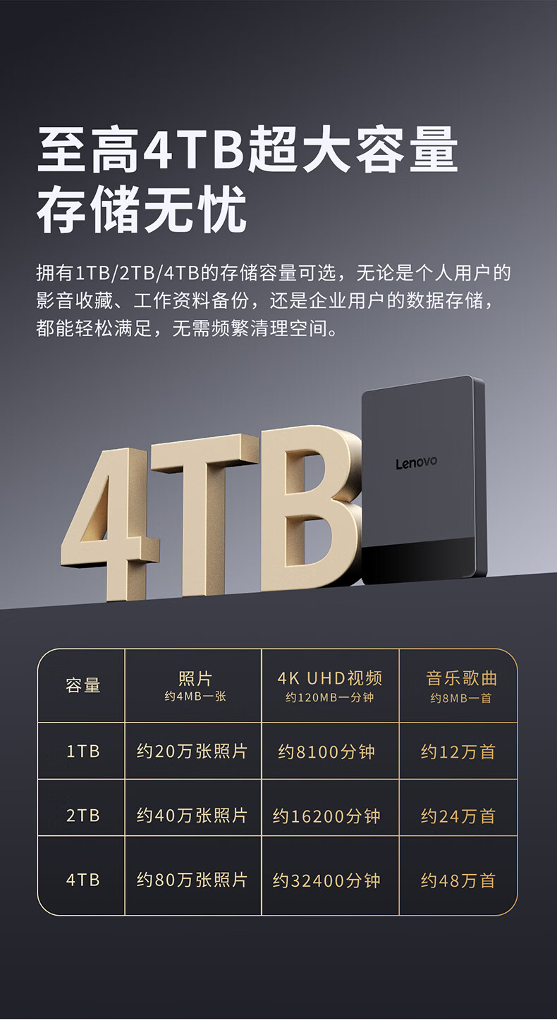 联想(Lenovo)1TB 移动硬盘 USB3.2 2.5英寸 黑色 机械