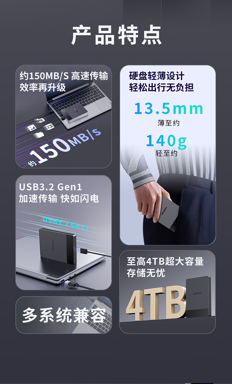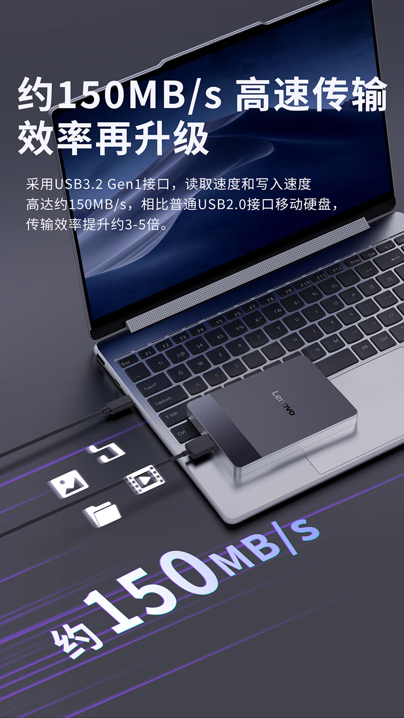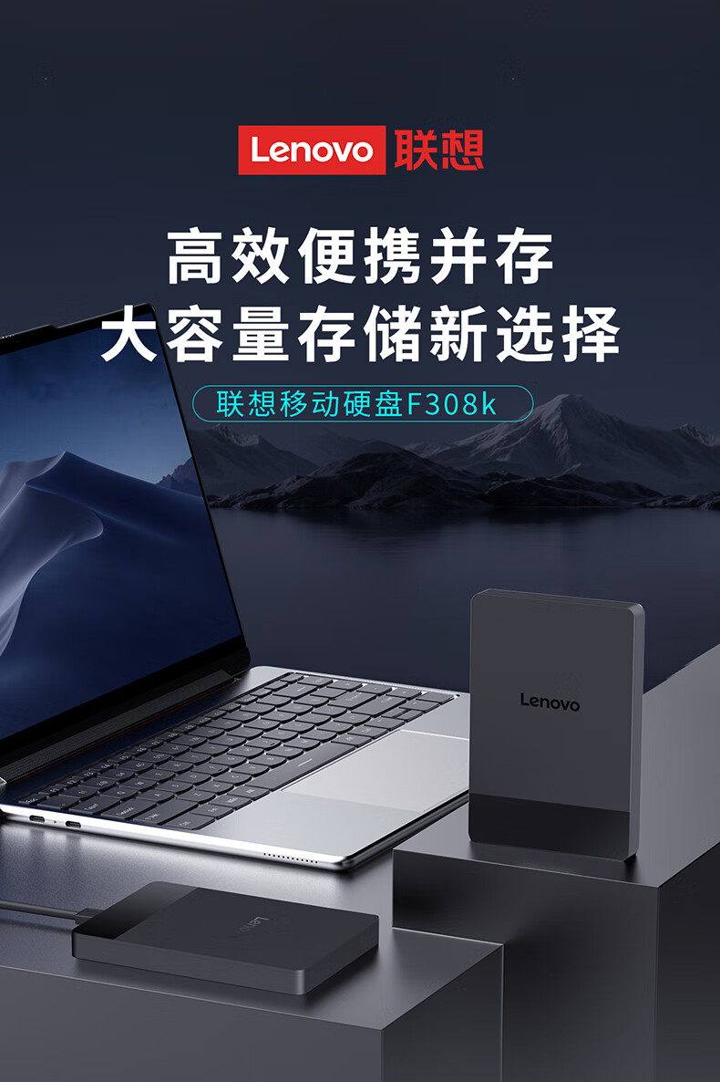 联想(Lenovo)1TB 移动硬盘 USB3.2 2.5英寸 黑色 机械硬盘 高速传输 轻薄便携 稳定耐用F308K